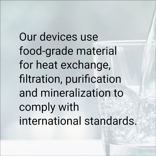 Unique, energy-efficient heat exchange module, using condensation as a means of producing fresh water. One liter of water costs 7-15 cents, which depends on local electricity costs.