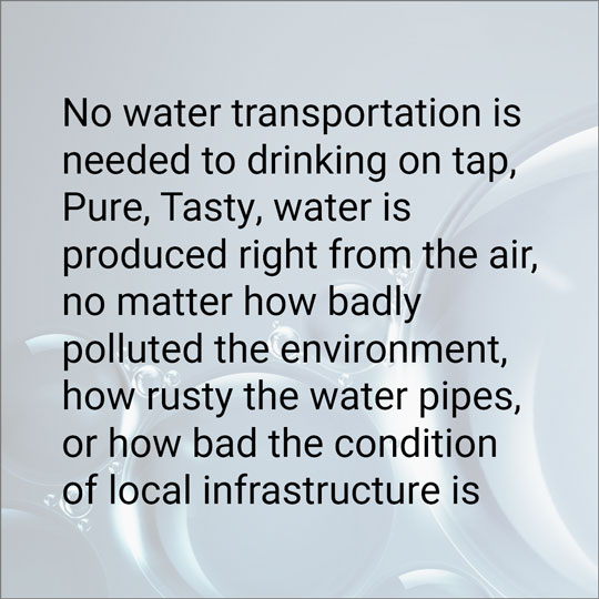 A E R O S’s solution is a new drinking water source for our earth. Production is at the point of use; no water transportation is needed.